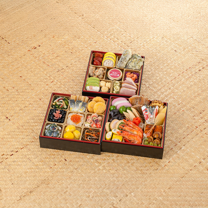 紅白蒲鉾、若桃甘露煮、赤魚味醂焼、伊達巻、味付数の子、なごみ巻(ほうれん草)、なごみ巻(海老)、小町ゆば、 花こんにゃく赤、花こんにゃく白、椎茸煮、焼筍煮、海老艶煮、田作り、真だら子旨煮、うぐいす豆、貝照焼、松竹梅松葉