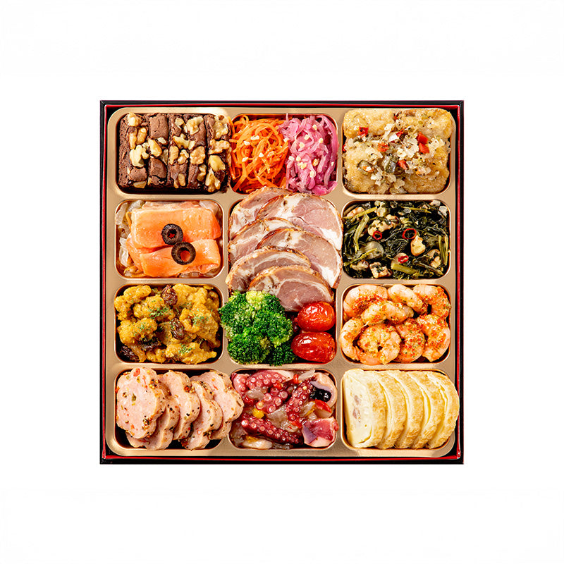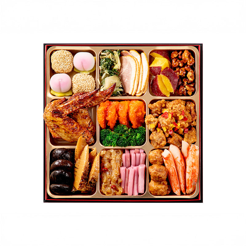 壱の重:たたきごぼう、伊達巻、金時人参入りなます、いくらの醬油漬け、わかさぎの胡麻和え、紅白かまぼこ、黒豆煮、梅形生麩、お祝い海老、数の子松前漬け、高野豆腐煮、花形人参煮、味付け絹さや、鶏肉の西京焼き、栗の渋皮煮、鳴門金時芋きんとん、ねじり蒟蒻煮、一口昆布巻き、花形お豆腐しんじょ、若桃甘露煮