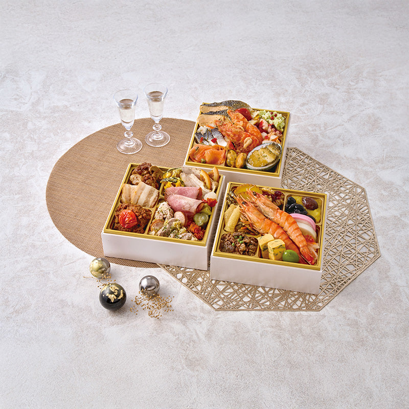 現代の名工を受賞した「銀座トトキ」十時シェフが監修したおせち。一の重は、定番の和風おせち。二の重は、肉をテーマにした肉おせち。三の重は、海鮮をテーマにした海の幸おせちが楽しめる三段おせちです。