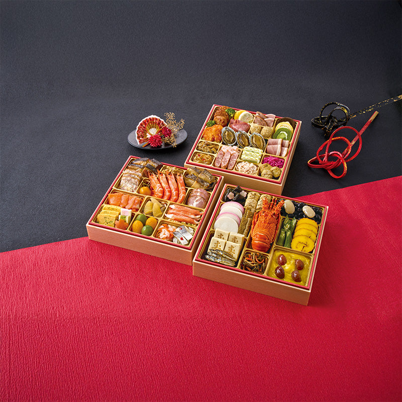 ぶり照焼×4、はすの芽梅酢風味3g、くるみ甘露煮30g、わかめ煮30g、真鯛幽庵焼×4、ミートローフ×3、有頭海老×4、金柑甘露煮、ローストポーク×3、キャロットラペ30g、スモークサーモントラウト×4、ソデイカ昆布和え30g、数の子×3、大根焙煎胡麻サラダ30g、蟹風味蒲鉾土佐酢漬×3、九条葱入り玉子焼×3、博多高野(海老)、博多高野(ほうれん草)、梅型蒟蒻、若桃甘露煮×2、杏子煮×2、紅白なます30g、こはだレモン30g