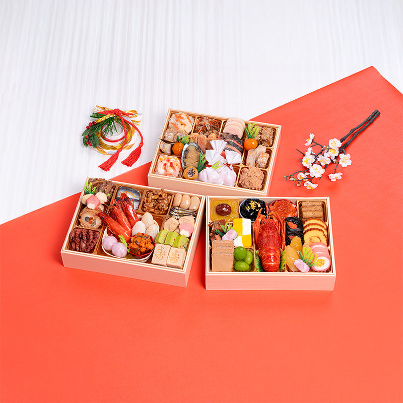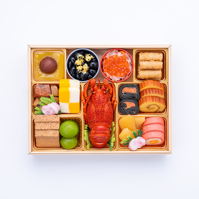 渋皮付き栗金団、金箔黒豆、紅白なます、いくら醤油漬、酢牛蒡、たら旨煮、錦玉子、紅白結び餅、鶏松風、若桃甘露煮、ロブスター、紅鮭昆布巻、伊達巻、数の子鼈甲漬、あかね真丈