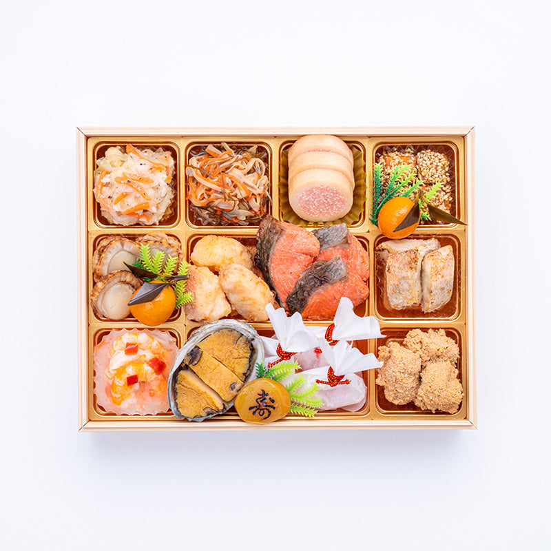 白身魚のエスカベッシュ、松前漬、烏賊魚卵射込、ごまさつま、金柑甘露煮、焼き帆立、赤魚南蛮漬、紅鮭白醤油焼、小鯛塩焼、海老マリネ、あわび旨煮、紅白祝袋、寿栗甘露煮、魚の子旨煮
