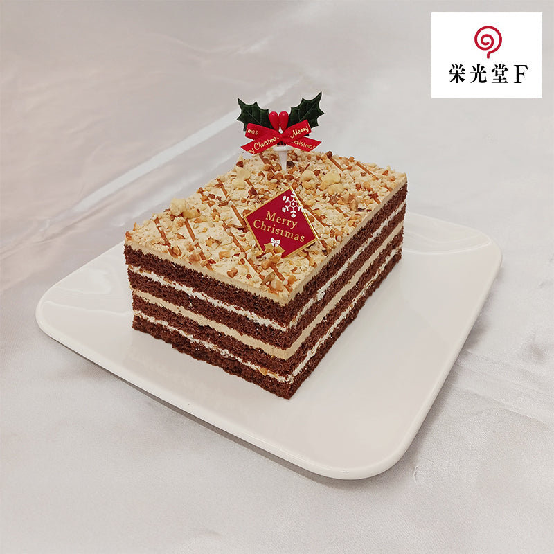 ココアスポンジに香ばしいプラリネ入りホワイトクリームとクリーミーなキャラメルクリームをサンドしました。仕上げにビターなキャラメルソースを掛けて香ばしい3種のミックスナッツを振りかけました。